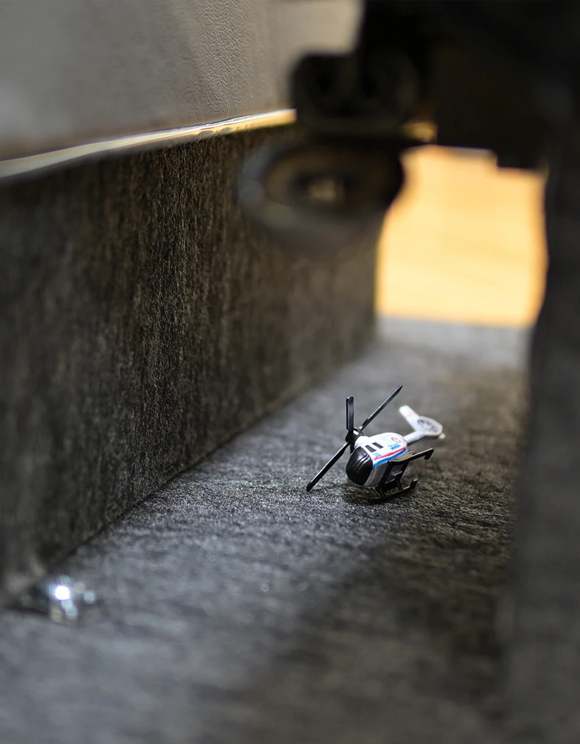 シートの隙間に落ちて取れなくなったおもちゃを忠実に再現。 ささやかな記憶を後部座席の風景として捉え、静かな品位をもってかたちにしました。 ふとした視線の先に立ち上がるのは、あの日に流れていた時間そのものです。