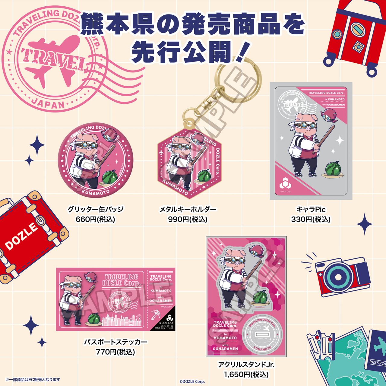 「旅するドズル社」グッズと、ご当地イラストを使用した各会場限定グッズを販売します。