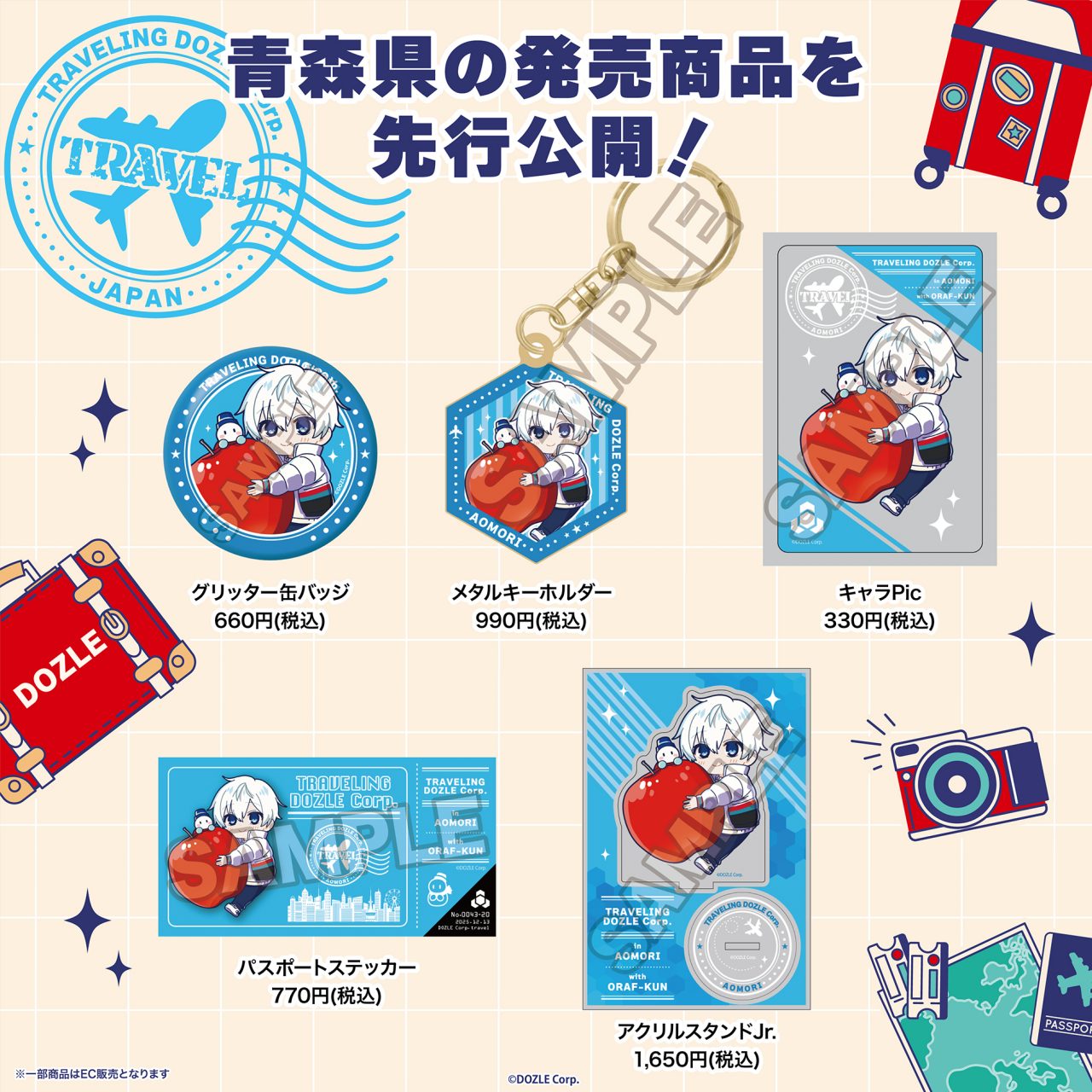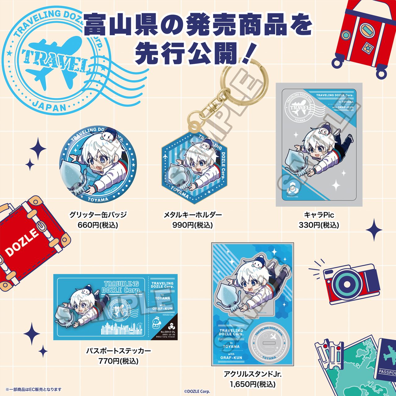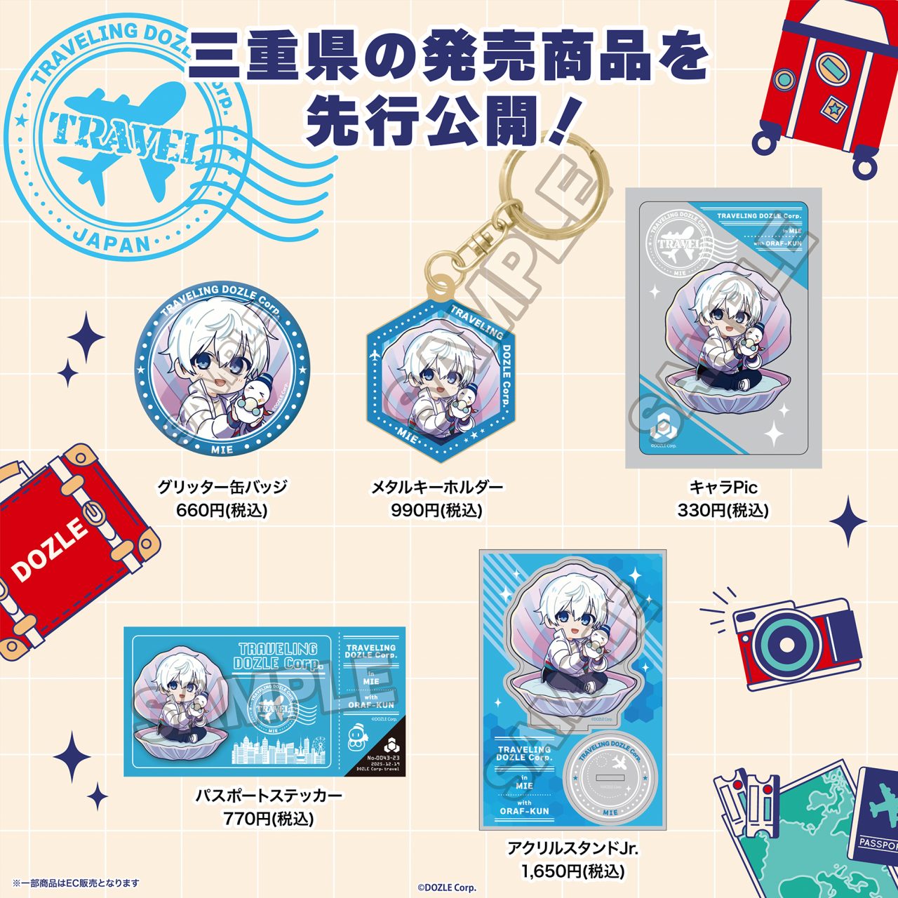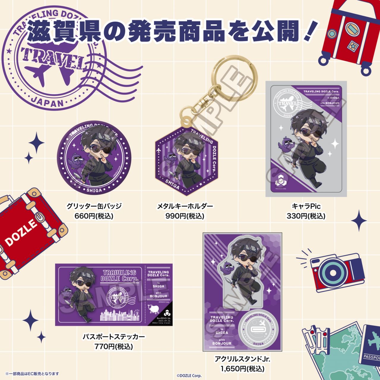 「旅するドズル社」グッズと、ご当地イラストを使用した各会場限定グッズを販売します。