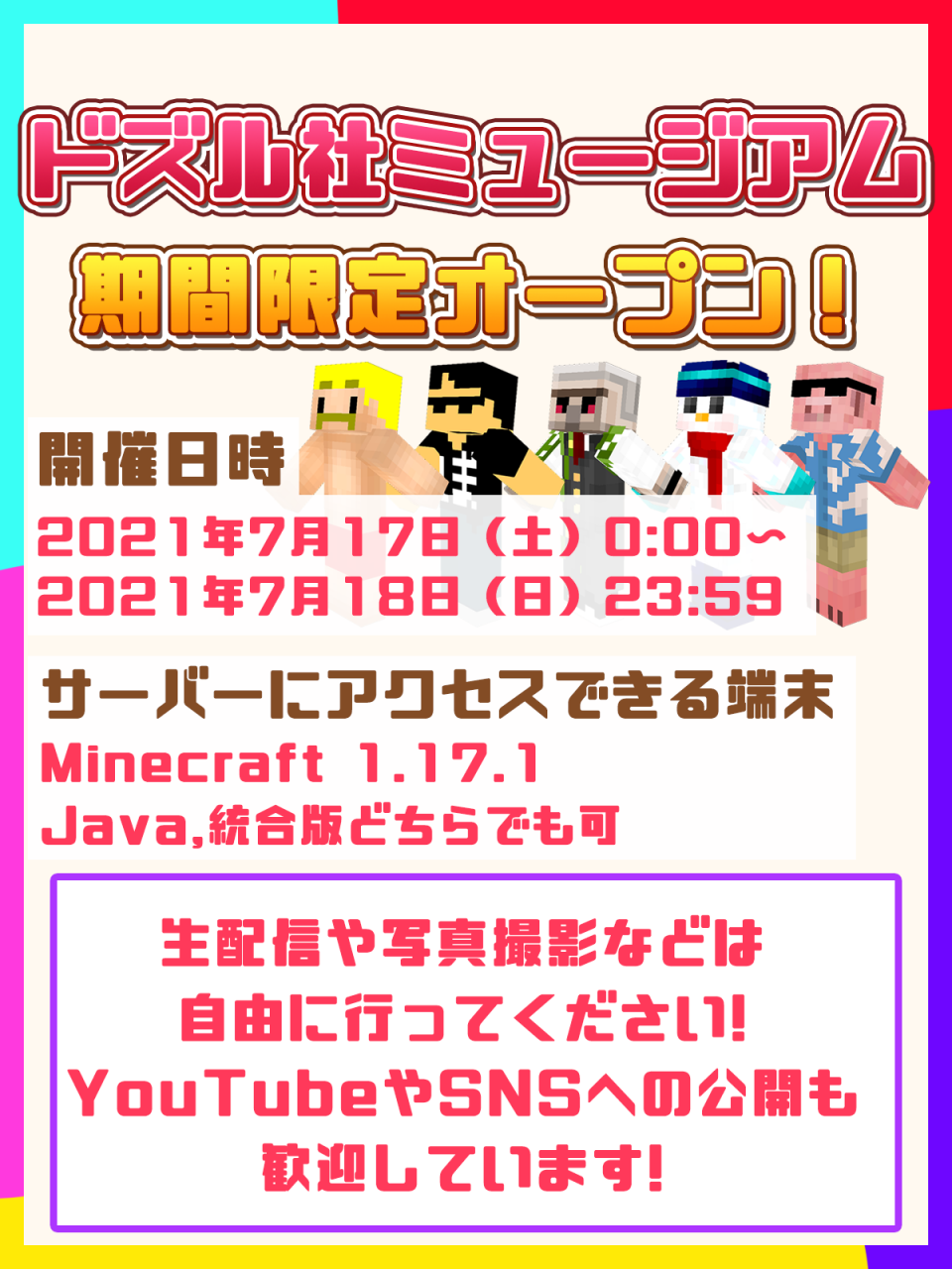Minecraft内に、自分で操作しながら色んなワールドに遊び行ける『ドズル社ミュージアム』を期間限定でオープンします。