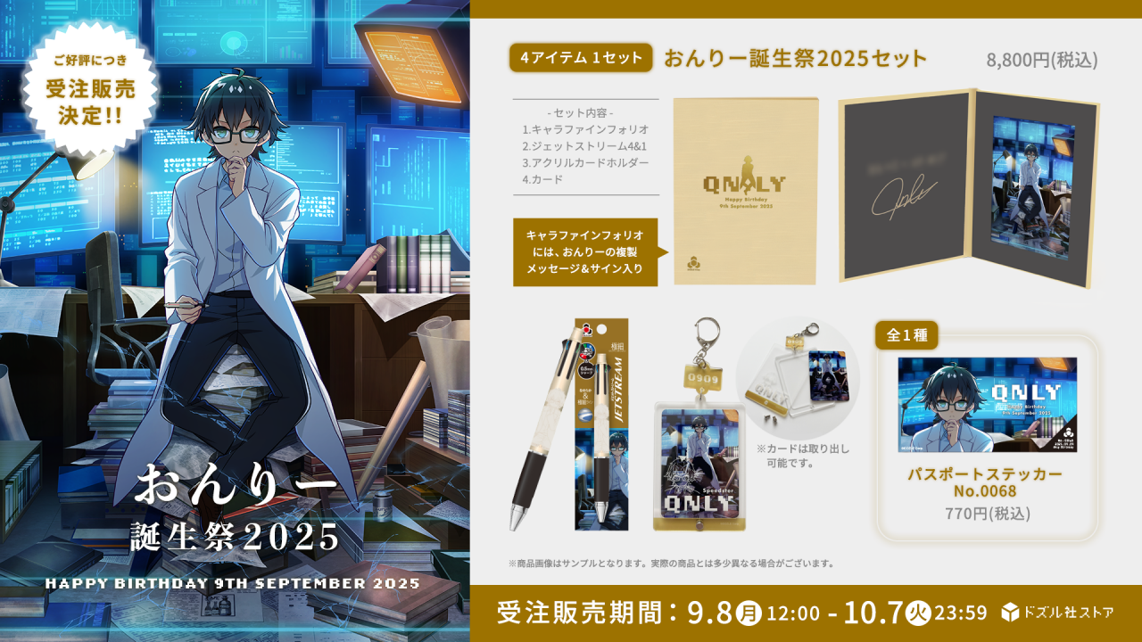 おんりーの誕生日を記念した「おんりー誕生祭2025」グッズを、2025年8月26日(火)12:00よりドズル社ストアにて発売します。