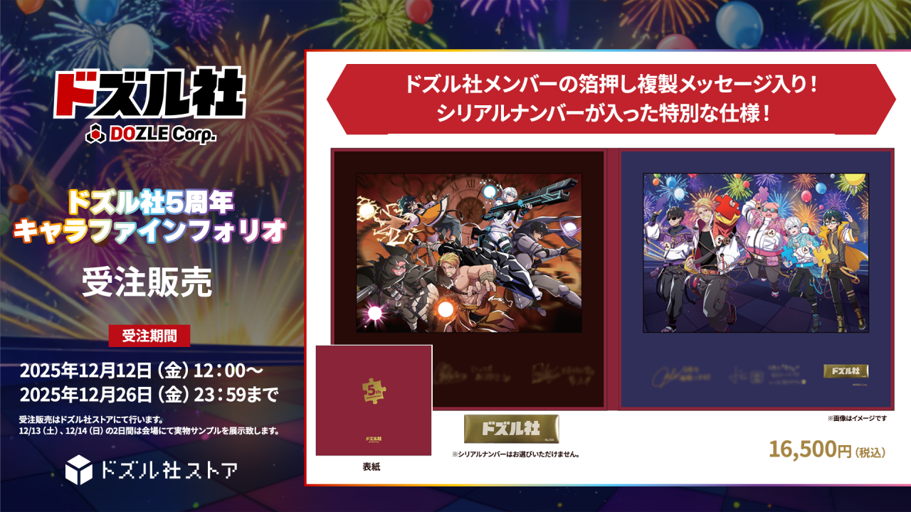 「時を駆けるドズル社」と「ドズル社5周年フェス」のビジュアルを使用したキャラファインフォリオを、ドズル社ストアにて2025年12月12日(金)12:00より受注販売します。
